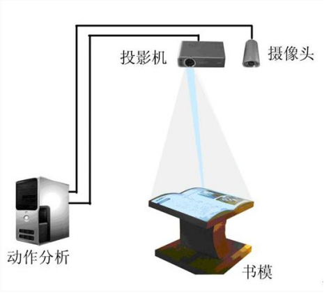 投影機將畫面投射到一本書的模型上,觀眾能看到一本書打開的樣子。通過兩個按鈕,觀眾可以選擇書的內(nèi)容,書的內(nèi)容及時通過投影機投射出來,觀眾站在書模型前做揮手動作時,翻書感應(yīng)器檢測出揮手的方向,計算機立即控制圖書翻頁,既可以向前翻也可以后翻,翻頁的同時可伴隨音效。