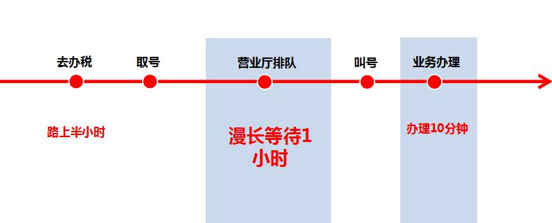 3、去辦事大廳辦理業(yè)務(wù),花半小時到達(dá)辦事大廳,取號,再等30-60分鐘甚至兩個小時時間,最后花10-15分鐘甚至更少時間用于實(shí)際辦業(yè)務(wù);
